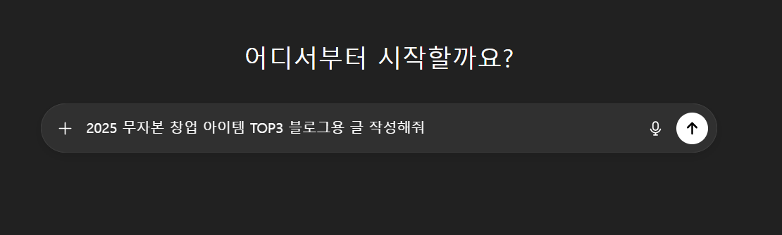 - ChatGPT에 “2025 무자본 창업 아이템 TOP3 블로그용 글 작성해줘” 같은 명령어를 입력해 포스팅용 콘텐츠를 생성합니다.